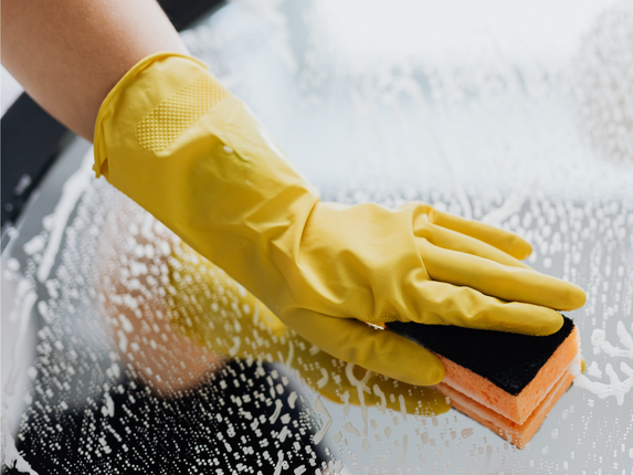 - Le bicarbonate de soude : traite les graisses incrustées et les taches tenaces. Saupoudrez légèrement la surface de bicarbonate humidifiée avec un peu d'eau. Frottez délicatement à l'aide d'une éponge non abrasive, puis rincez le tout.